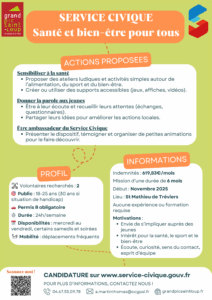 Dans le cadre du Service Civique, la Communauté de communes recrute deux volontaires âgés de 18 à 25 ans pour une mission intitulée « Promouvoir la santé et le bien-être de tous ». Cette mission débutera en novembre 2025 pour une durée de six mois.