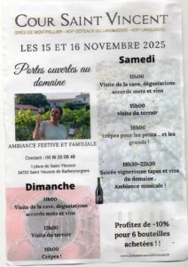 Ouf ! L’événement que l’on attendait tous est enfin d’actualité…Ne ratez pas ces deux jours de découverte, de partage, d’ambiance chaleureuse et musicale. L’occasion de découvrir d’excellents vins avec leur explication, de visiter le Domaine cour saint vincent, de découvrir quiches et autres mets entre deux dégustations…C’est toujours un grand moment…Dans une belle ambiance festive.