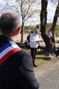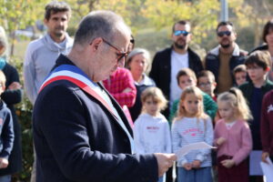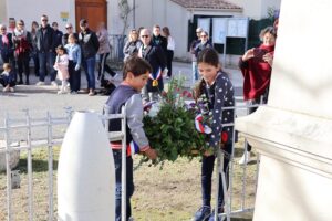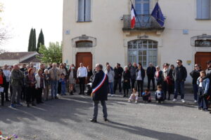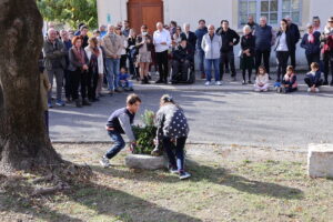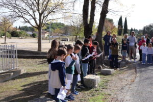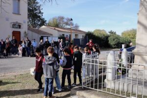 Beaucoup d’habitants ont fait le déplacement, et les enfants de la classe d’Alexandra ont lu de magnifiques textes. Olivier a lui aussi lu un poème, du « poète de la guerre », après que Frédéric Caussil, Maire, ait lu le texte officiel, suivi d’une minute de silence…Puis, après une belle Marseillaise entonnée par la majorité du public, chacun a pu, autour du verre de l’amitié, évoquer souvenirs et projets.