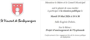 Conformément à l’engagement pris lors de la réunion publique du 10 mars 2026, avant l’élection municipale, vous êtes invité à participer à la réunion publique du 19 mai 2026 ayant pour thème « Projet d’aménagement de l’Esplanade ».